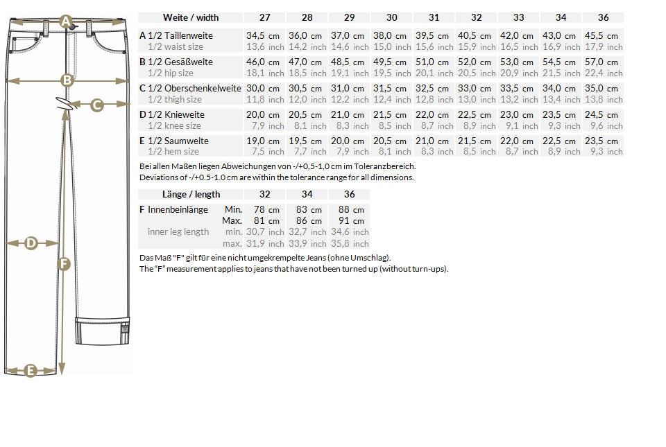 Wenn Du Dir unsicher bist, legst Du am besten Deine Lieblingsjeans glatt vor Dir hin und misst wie auf der Zeichnung in der jeweiligen Maßtabelle angegeben. So kannst Du die Maße perfekt vergleichen und Du solltest genau die richtige Größe für Dich finden können.