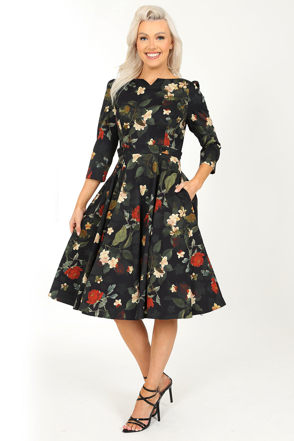 Das wunderschöne Leia Floral Swing Dress ist aus der klassischen, dehnbaren Baumwolle gefertigt, die für Hearts & Roses typisch ist. Sie ist weich und super angenehm auf der Haut. Der Print mit seinen zarten roten und gelben Blütenblättern neben weichen grünen Blättern auf tiefschwarzem Grund ist perfekt für einen Winterspaziergang oder einen Kaffee in der Stadt. Die subtile Schönheit dieses Prints spricht für sich. Der schlichte Schnitt lässt den Print perfekt zur Geltung kommen. Der U-Boot-Ausschnitt mit vorderem Schlitz harmoniert wunderbar mit dem detaillierten Taillenbund und dem fließenden Rock. Dieses Kleid kann solo getragen werden – einfach Schuhe dazu und fertig ist der Look!