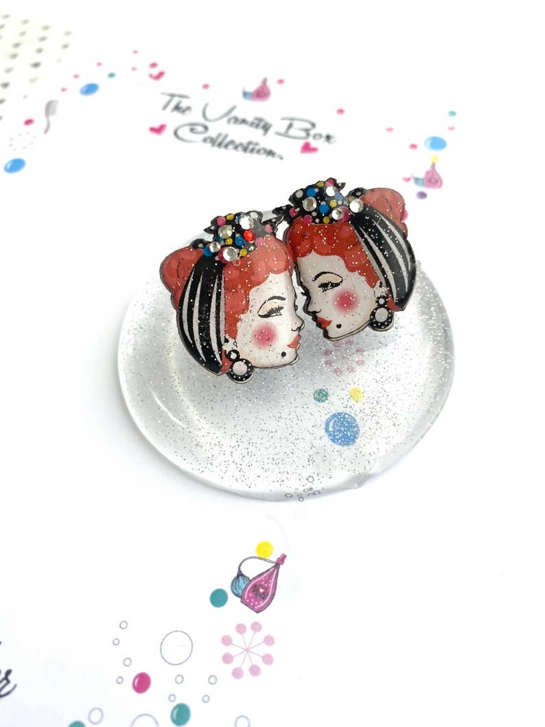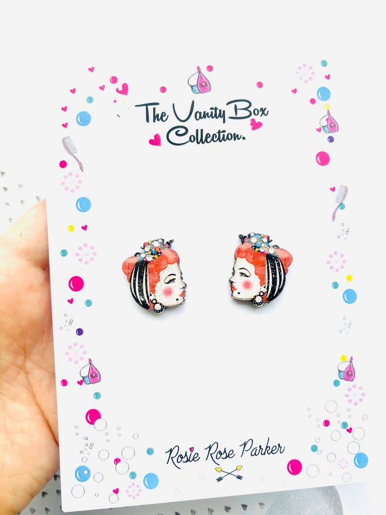 Super niedliche, handgefertigte Ohrstecker in Form eines Pin-up-Girl-Gesichts der 50er Jahre! Die Stecker sind handgemacht und einfach zuckersüß. Sie funkeln oben am Haarband und sind ein Muss für jeden Rockabilly Fan!
