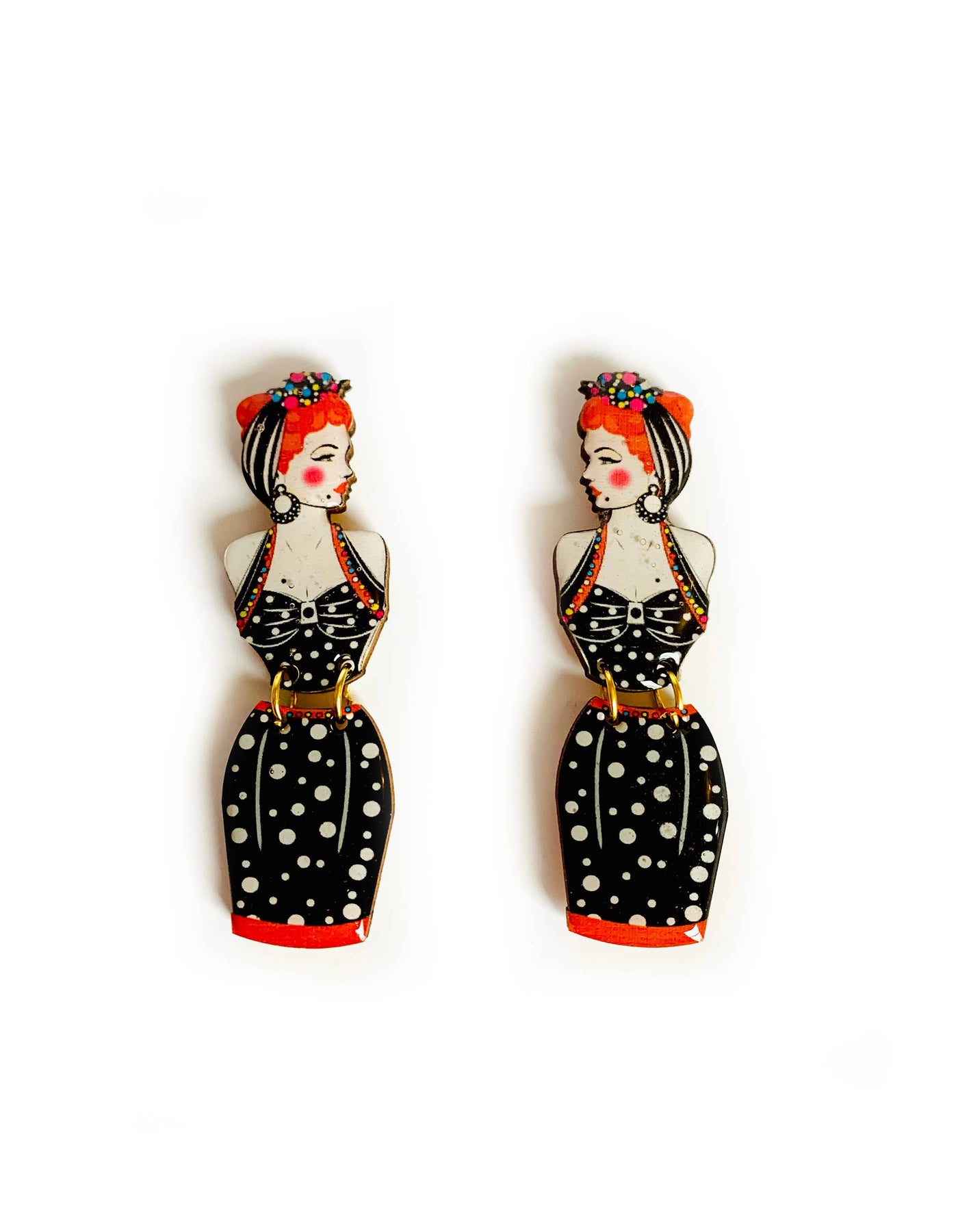 Da verdreht man sich den Kopf nach, nach diesen fabelhaften Ohrringen! Das Highlight zu deinem Vintage-Outfit: eine glamouröse 1950-inspirierte Frau in einem schicken schwarzen Polka Dot Kleid, rotem Kopftuch und mutigen Ohrringen. Hergestellt aus leichten Holzausschnitten, Glasharz, mit lebendigen gedruckten Details, sind diese handgemachten Ohrringe angenehm zu tragen und machen gleichzeitig ein großes Statement.