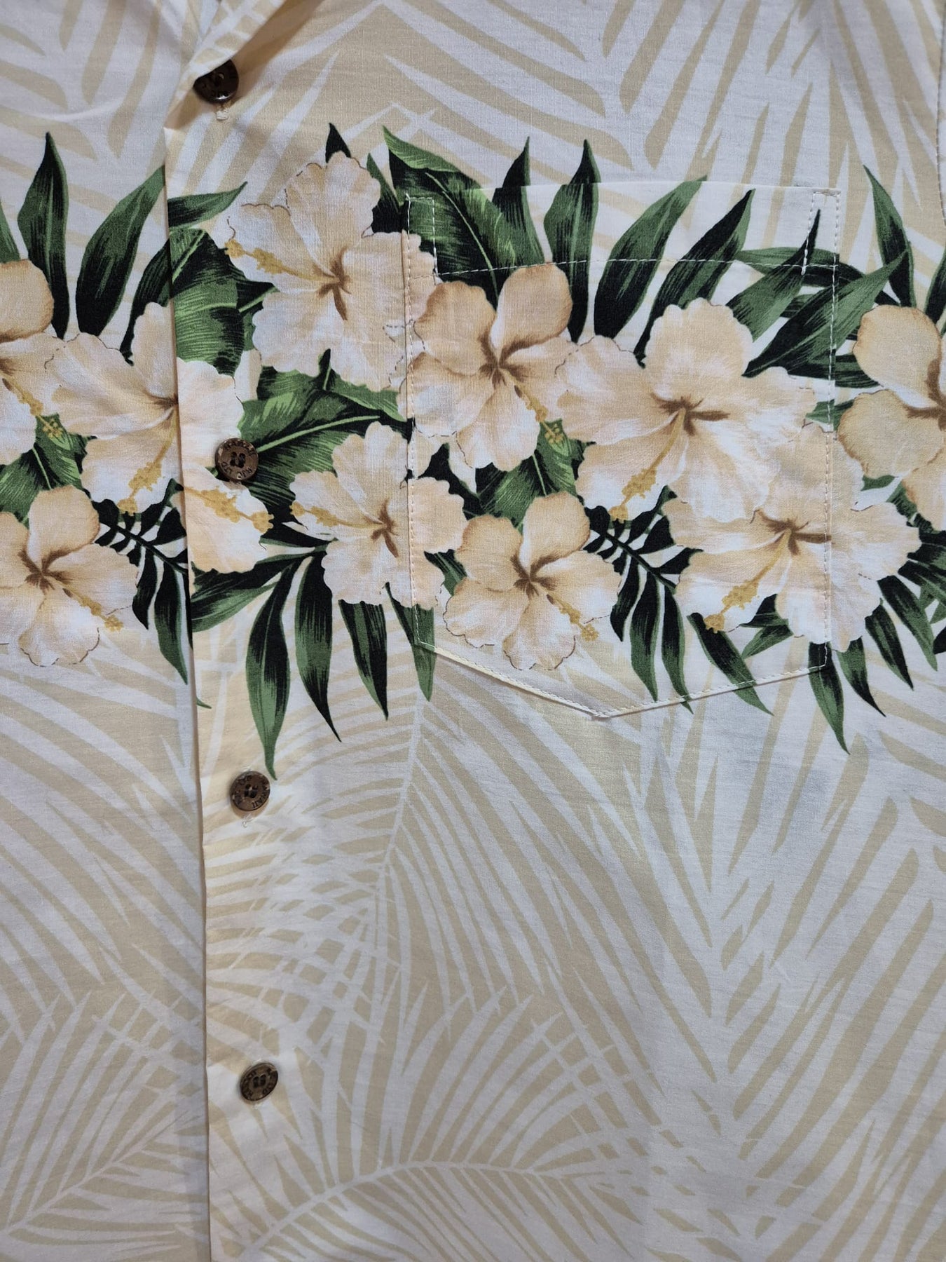 Original aus Hawaii. Traumhaftes es Hawaiihemd mit einem hell-sandfarbenen Hintergrund mit weißen Blättern. In Brusthöhe umringt das Hemd eine Bordüre aus ebenfalls sandfarbenen Blüten und dunkelgrünen Blättern. Wunderschön! Sicher dir schnell deins! Wie alle Hemden von RJC ist es aus einem ganz feinen, weichen Baumwollstoff gefertigt. Tolles Design, lockerer Schnitt, originale Kokosnuss-Knöpfe, Tasche perfekt ins Muster eingepasst – das macht ein echtes Hawaiihemd aus!