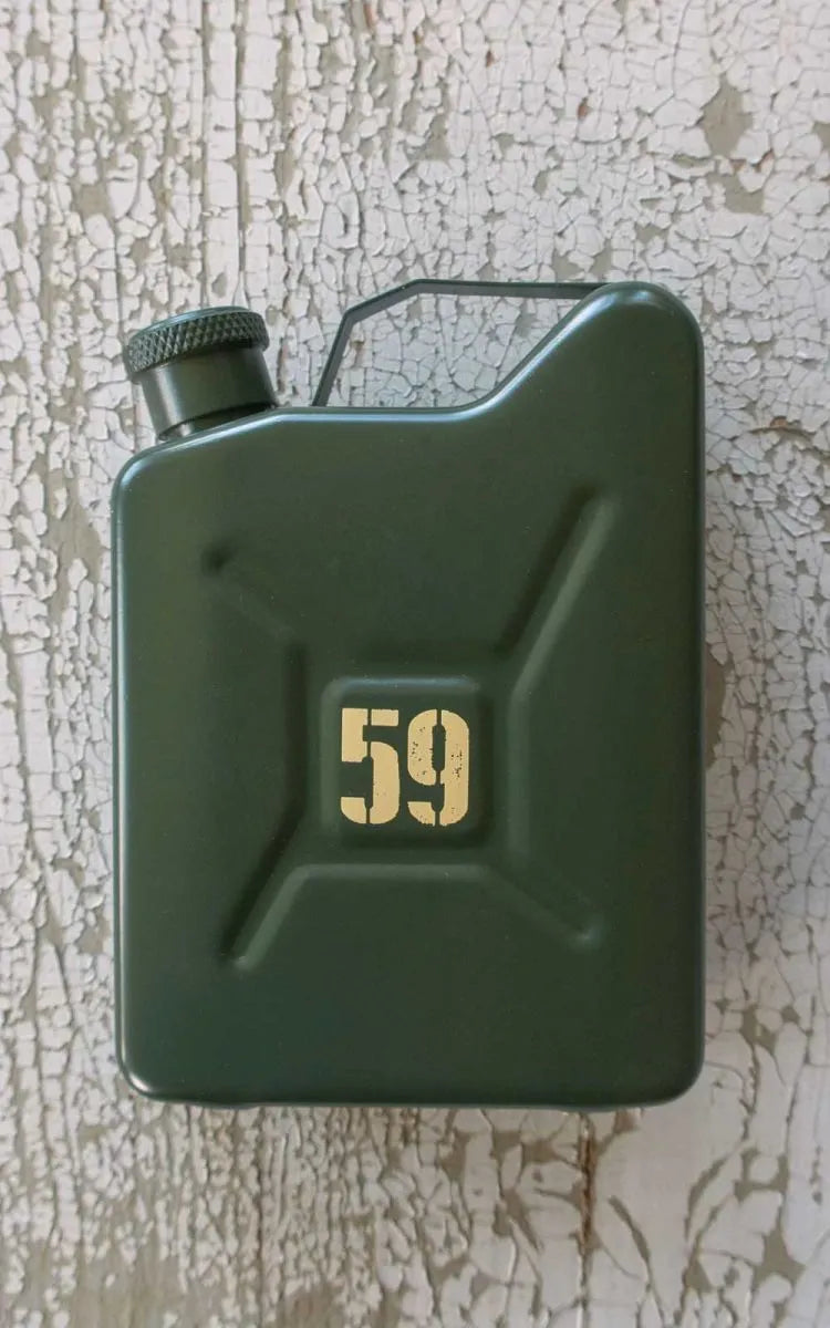Olivfarbener Benzinkanister als 5oz Flachmann.