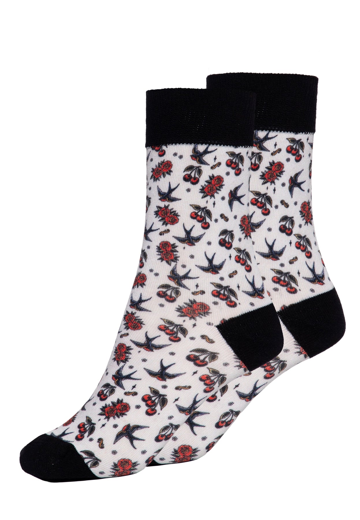 Queste calze di King Kerosin uniscono il glamour senza tempo degli anni '50 con un tocco hawaiano. Con un design tropicale a motivi di cocktail e tiki, queste calze portano un'atmosfera da vacanza nel tuo armadio. Un must-have assoluto per tutti coloro che amano il vintage-chic!